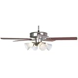 This brushed steel finish traditional ceiling fan by Casa Vieja® is both versatile and functional. It includes a convenient hand-held remote control, 5 reversible walnut/cherry finish blades, 52" blade span, 13 degree blade pitch and lifetime motor warranty. Comes standard with 4-1/2" downrod. Brushed steel finish. Reversible walnut/cherry finish blades. 52" blade span. 13 degree blade pitch. Lifetime motor warranty. Included Hand-held remote control. Four light cap kit (bulbs not included). Four Deco side glass. Fan height 11.8" blade to ceiling (with 4-/12" downrod). 4 1/2" downrod control included. Canopy 3.15" height and 5.16" wide.